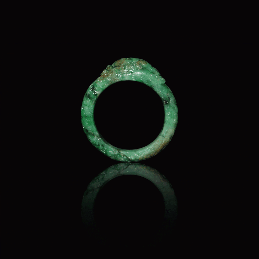 這是一件清代祝壽靈芝紋翡翠手鐲,屬清代玉器工藝的精品之作。其以高冰種翡翠為材,色澤濃郁瑩潤,兼具“種水色”之美。鐲身通體浮雕靈芝紋,紋飾飽滿舒展——靈芝自古為“長壽瑞物”,搭配婉轉流暢的纏枝線條,既契合清代玉器“圖必有意,意必吉祥”的審美,又暗藏“福壽綿延”的祝壽寓意。這類手鐲的擁有者,身份地位必然非常尊貴。