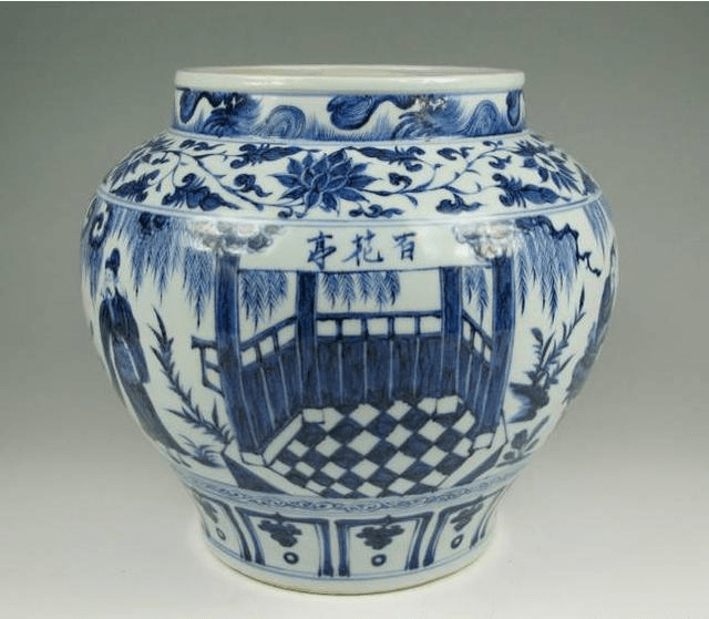 元青花百花亭图罐题材取于元代著名杂剧“逞风流王焕百花亭”故事,戏说当时有一风流书生叫王焕,春游百花亭,邂逅了名妓贺怜怜,两人一见钟情,在一起生活了半年,但是半年后王焕的钱花光了,于是老鸨立马赶他出去,并且还将贺怜怜卖给了西延将军高邈,后来王焕贺怜怜两人想方设法终相见解相思,贺怜怜变卖自己的首饰等物品,收集财务资助王焕,且让他到西延边关从军,并告知很多关于高邈违法的行为,后来王焕到西延边关屡立功劳,被封西凉节度使,并且将高邈告上朝廷,夺回爱人贺怜怜。