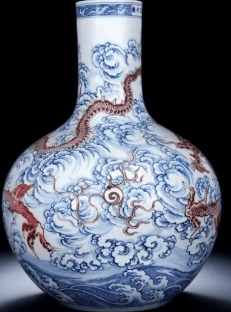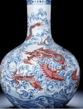 1、清雍正 御制青花釉里红云海腾龙大天球瓶 「大清雍正年制」款