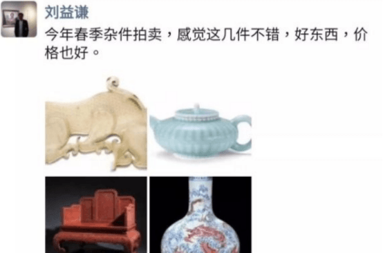 这一理念在他的收藏实践中体现得淋漓尽致。2019年春季拍卖季,刘益谦一举拿下四件重磅器物,总成交价高达约2.54亿元人民币。事后,他在微信上晒出这四件古玩的照片,并配文颇为淡然:「今年春季杂件拍卖,感觉这几件不错,好东西,价格也好。」